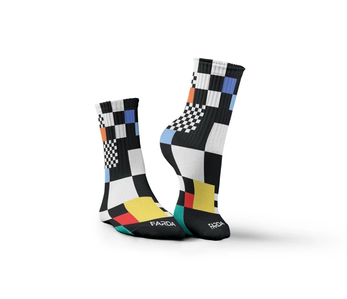 جوارب موندريان مستوحاة من الفن التجريدي الكلاسيكي بخطوط هندسية دقيقة وألوان أساسية جريئة، تجمع بين الأبيض والأسود بلمسات من الأزرق، الأحمر، والأصفر في توازن يخطف النظر من أول خطوة تصميمها يوصل إحساس الجرأة والرقي في آن واحد، لكل من يحب التفاصيل اللي تفرّق وتعبّر عن ذوق فني حقيقي