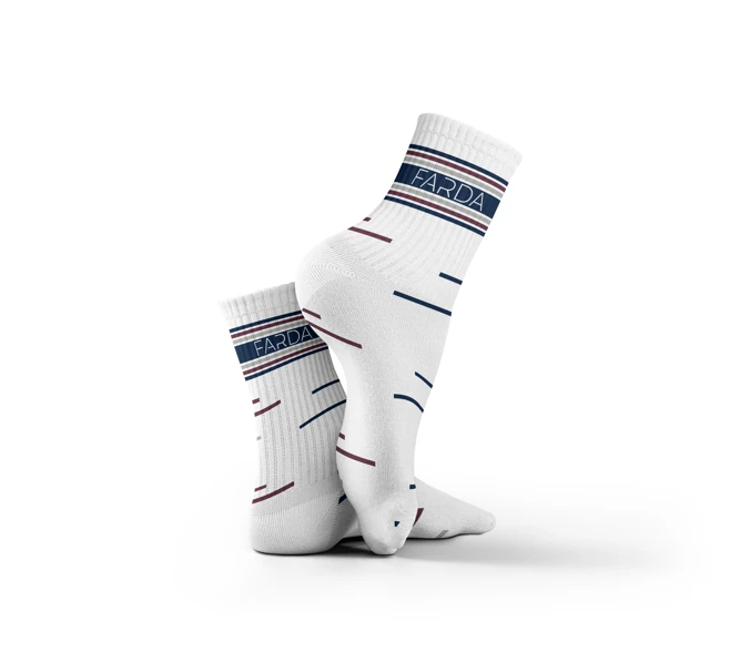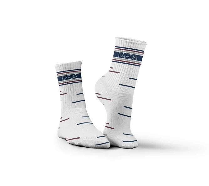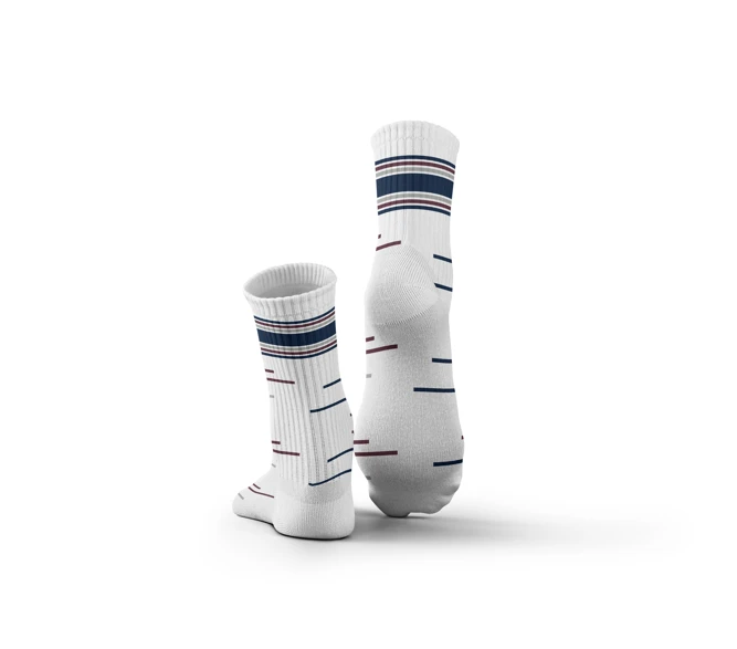 بألوان الأبيض النقي تتخللها خطوط زرقاء داكنة وخمرية تمنح الجورب طابعًا راقياً ومفعماً بالثقة